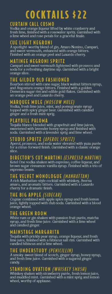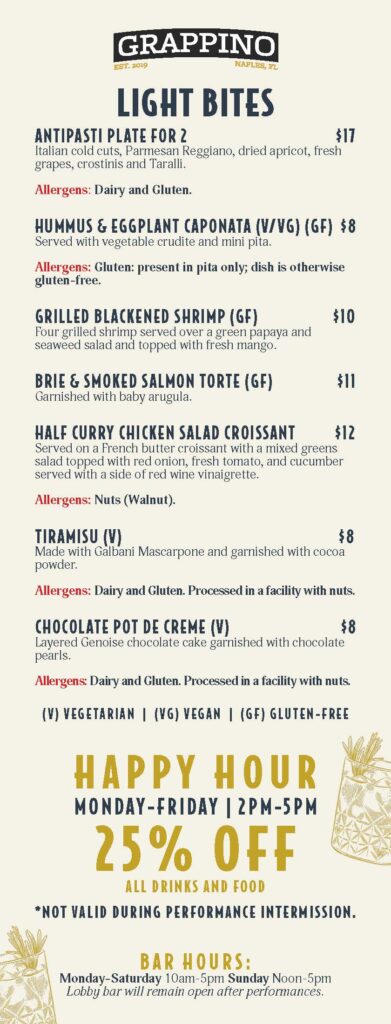 Our Lobby Bar is open Monday-Friday 10AM-5PM and during performances